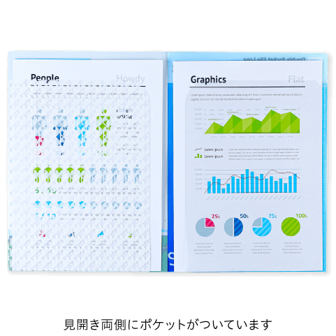大きめの両側ポケットでたくさんの書類をがっちりキープできるのはもちろん、見開きA3サイズの資料を挟み込むのにも便利なため、普段使いの事務用品や営業ツールなどとしてオススメです。