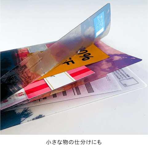 中仕切りが 1枚ついた A6サイズの仕切り付きクリアファイルです。仕切り部分にも印刷可能で、各種カードやレシート、保険証等の小さい用紙整理に最適な商品です。 小さなかばんにも入れられ、持ち歩きに便利です。