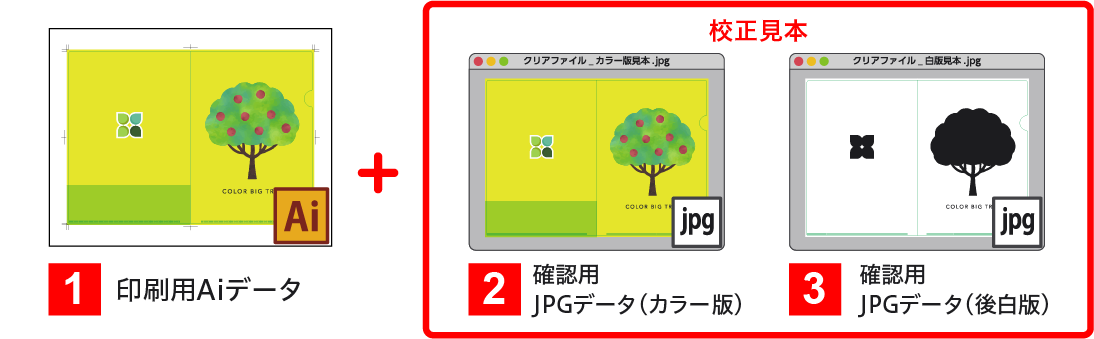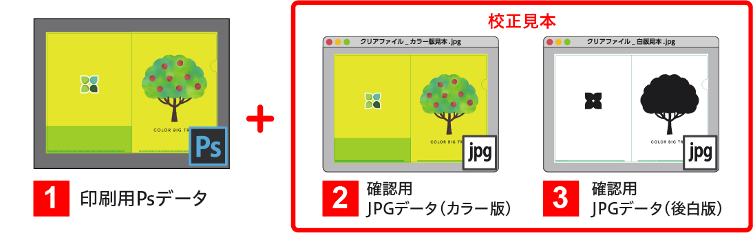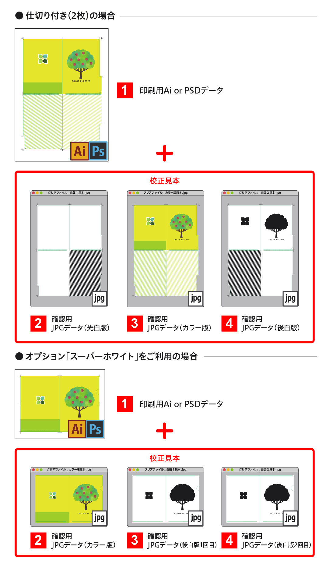 ご入稿頂いたデータの不備・誤りを確認するために、以下の図の通り、印刷用の元データとは別途、必要な版(カラー版、白版など)全ての「校正見本」(PDFもしくはJPGのスクリーンショット)が必要です。