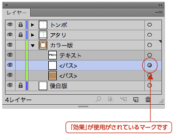 レイヤーパネル内のサブレイヤー右端の◯印が点灯していると、何かしらの「効果」が使用されているということになります。
