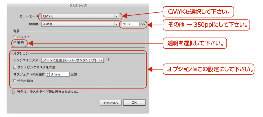 また、ラスタライズを行う前には必ず「ドキュメントのラスタライズ効果設定」をご確認ください。
