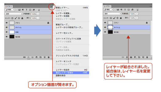 結合したいレイヤーを選択した状態で、レイヤーウインドウのオプション画面から「レイヤーを結合」を選択してください。